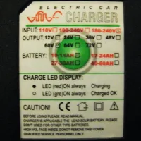 Використовується для заряджання свинцево-кислотних акумуляторних батарей 60В, 10-14 Ач. Вхідна напруга: 180-240, 50/60Гц, 0,8А. Максимальний струм заряджання – 1,8А. Довжина дротів – 950 мм, габарити: 190х60х100, вага – 575 г.